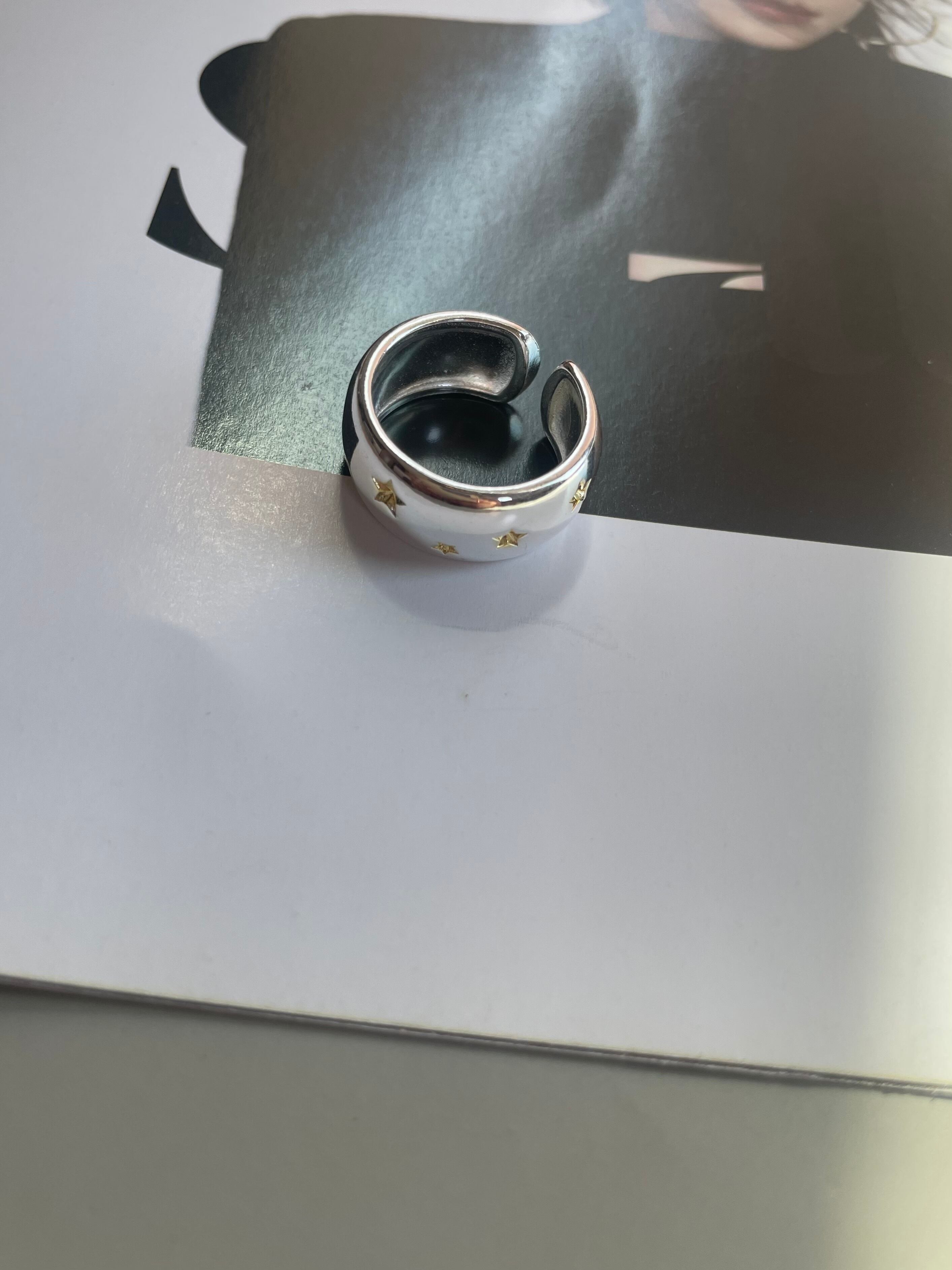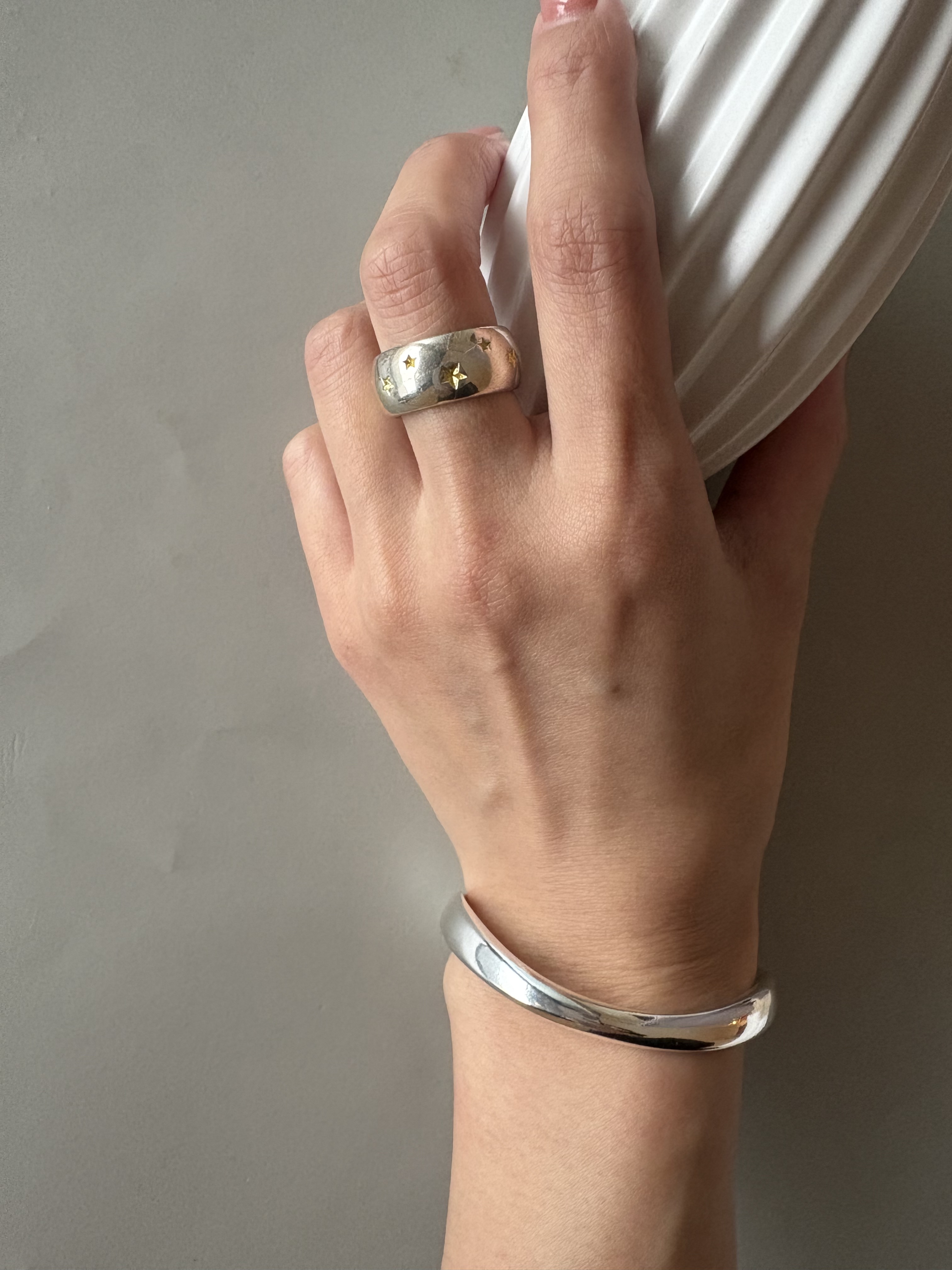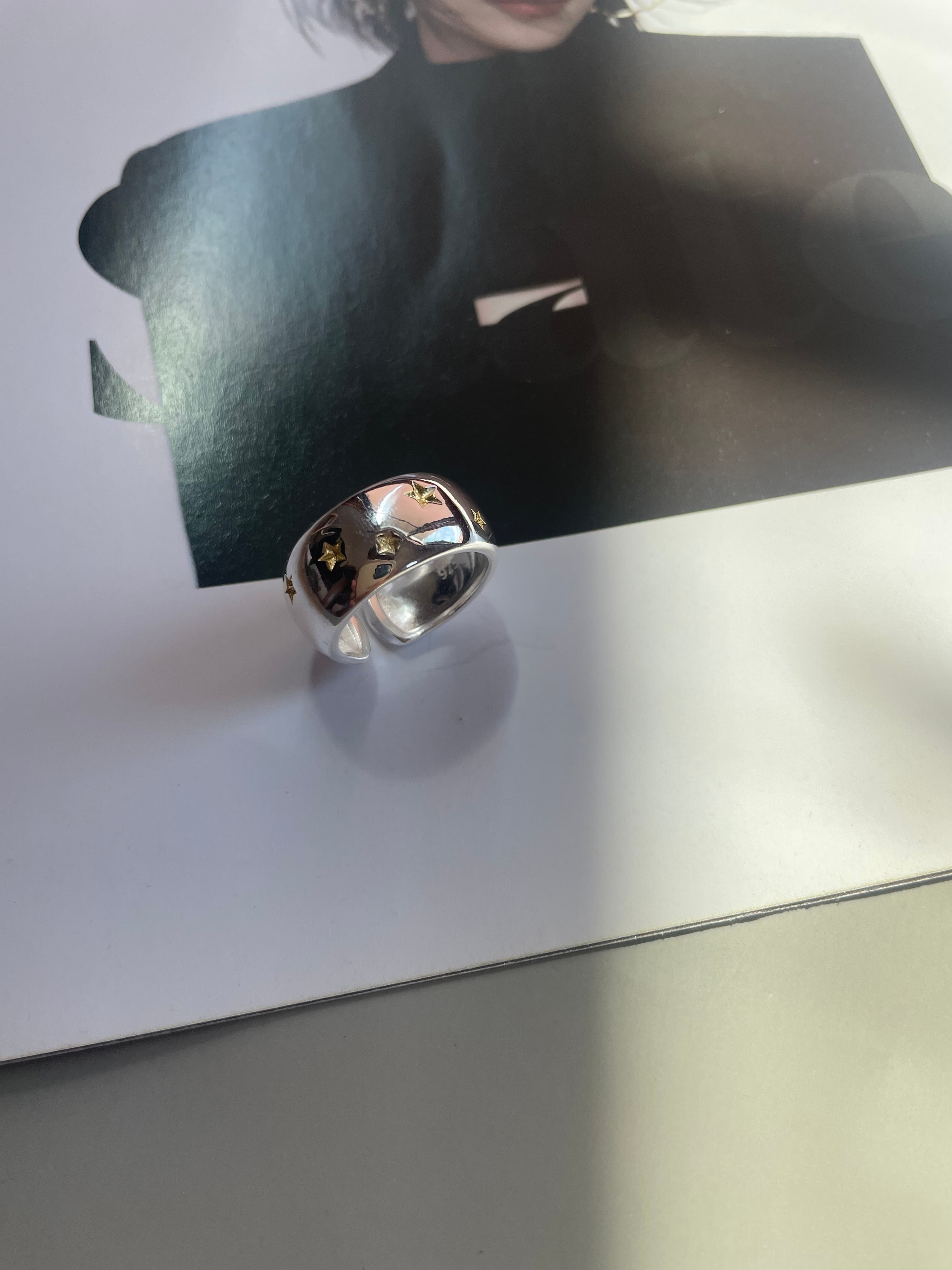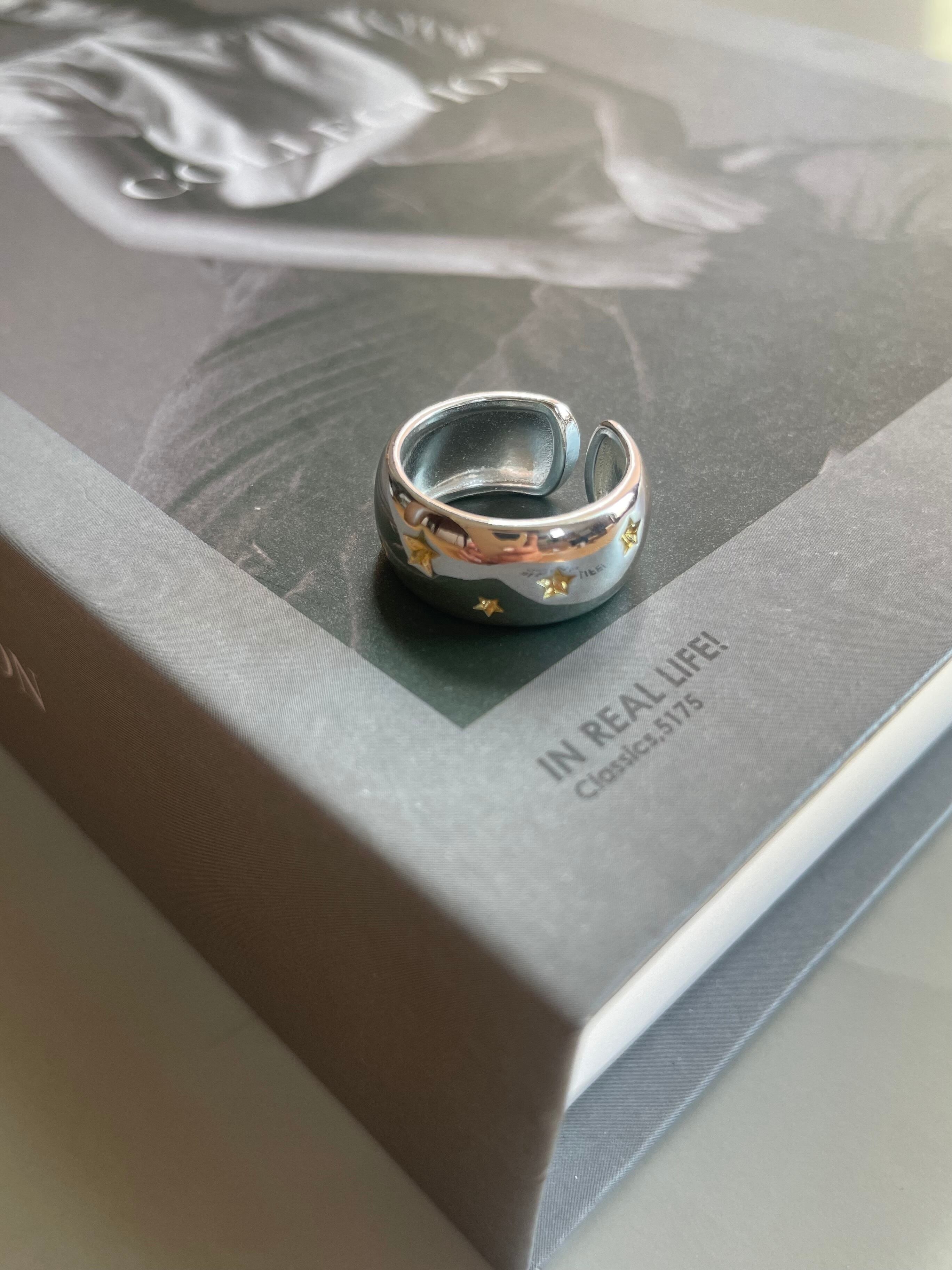 純淨的銀色鏡面戒上散布著精巧的金色星辰。