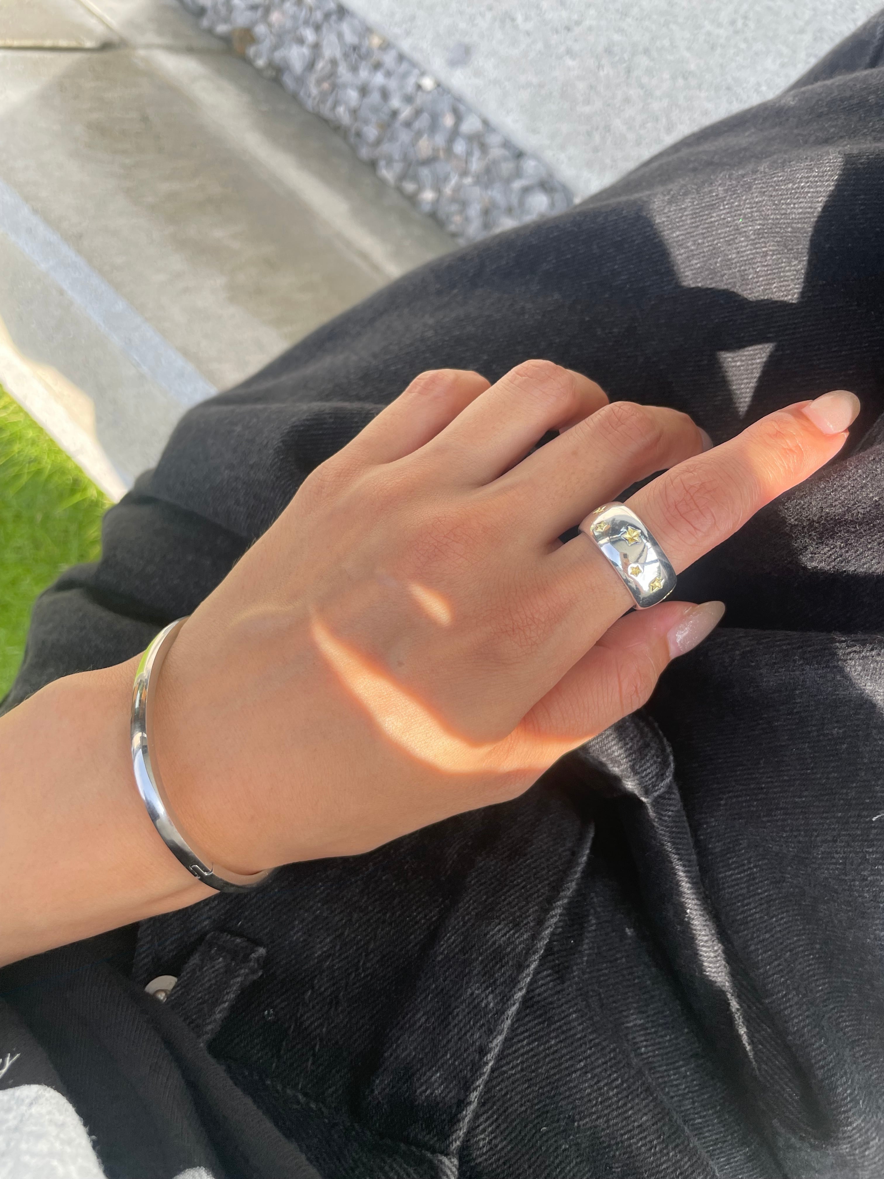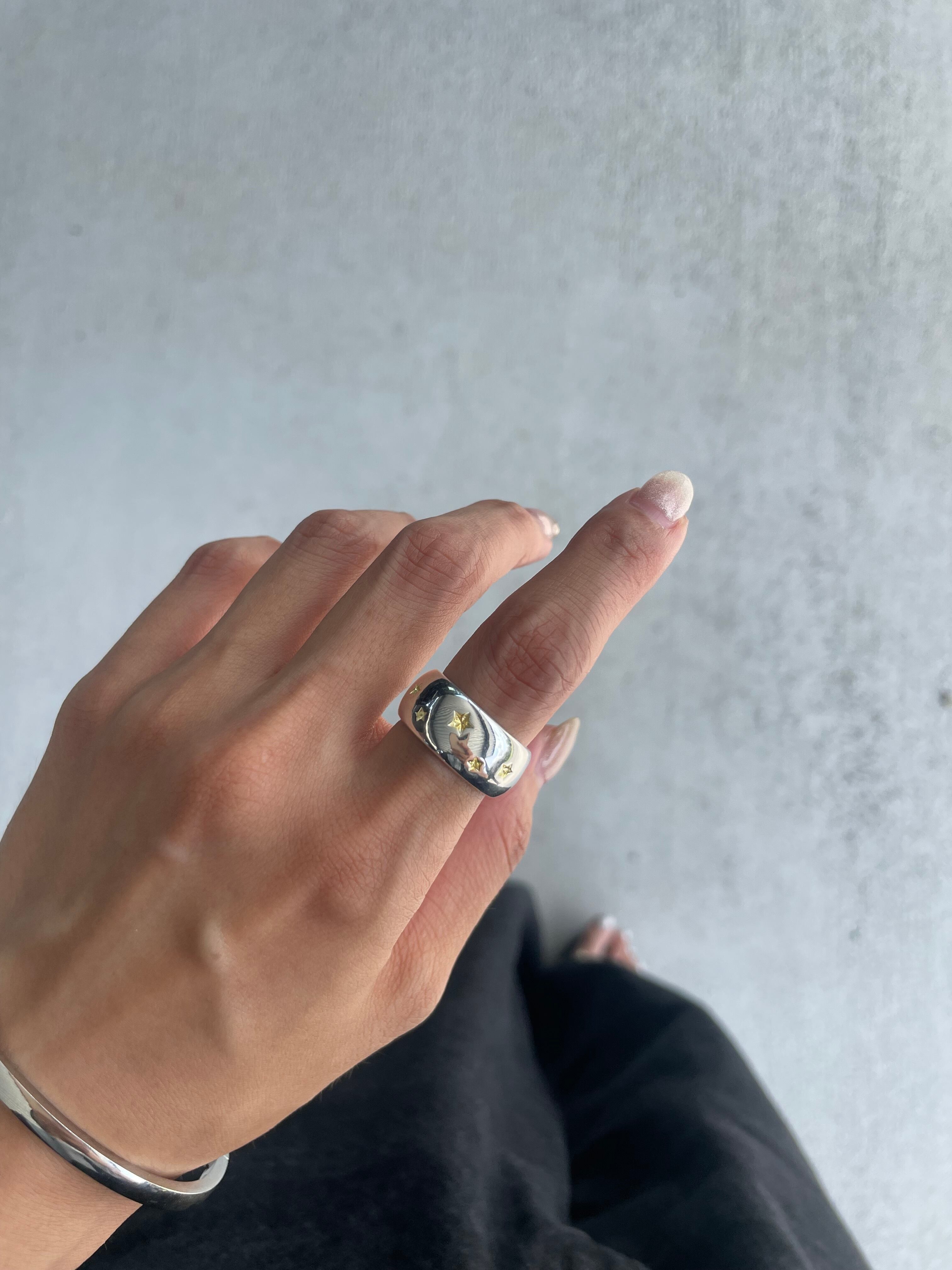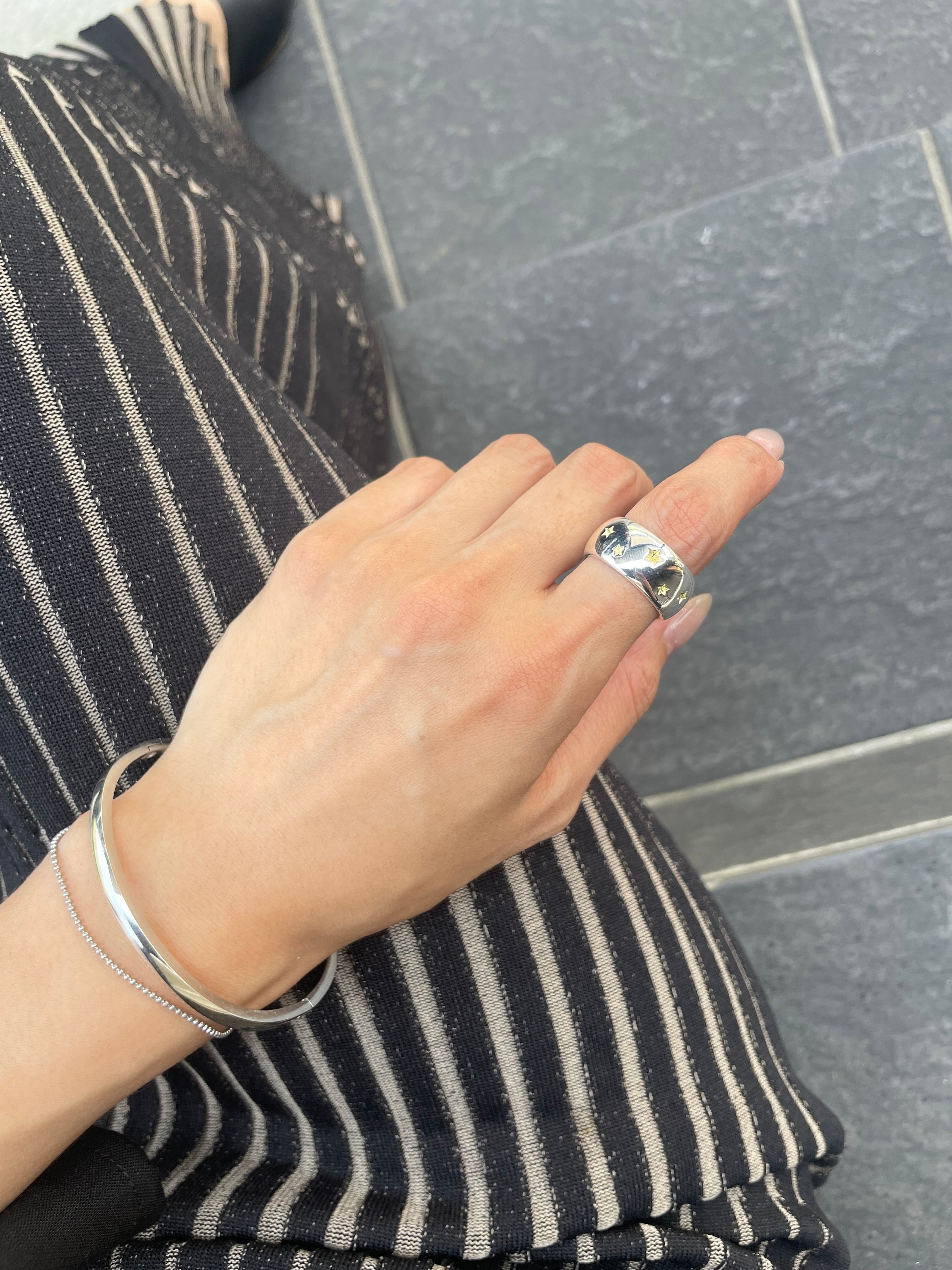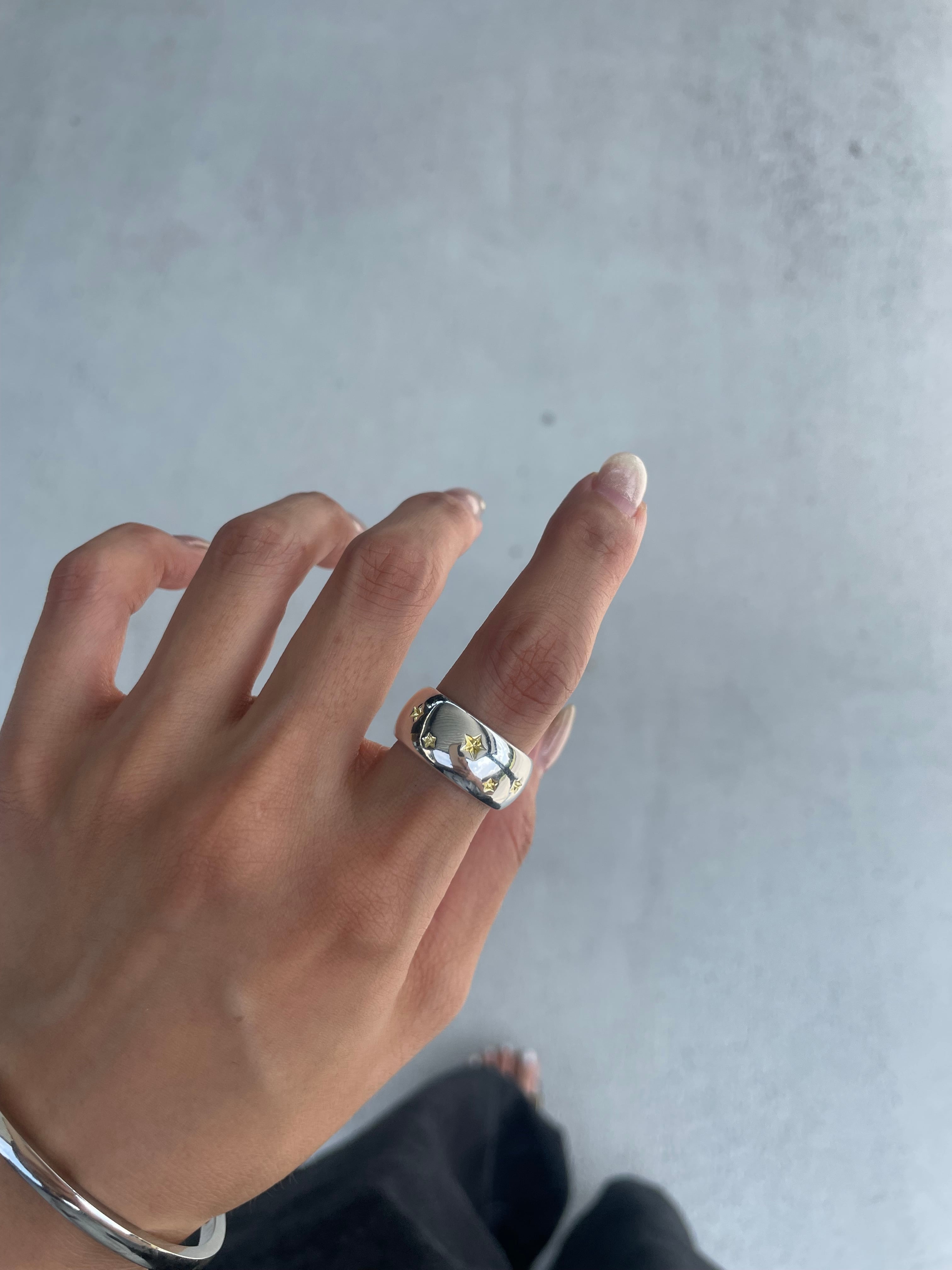 純淨的銀色鏡面戒上散布著精巧的金色星辰。