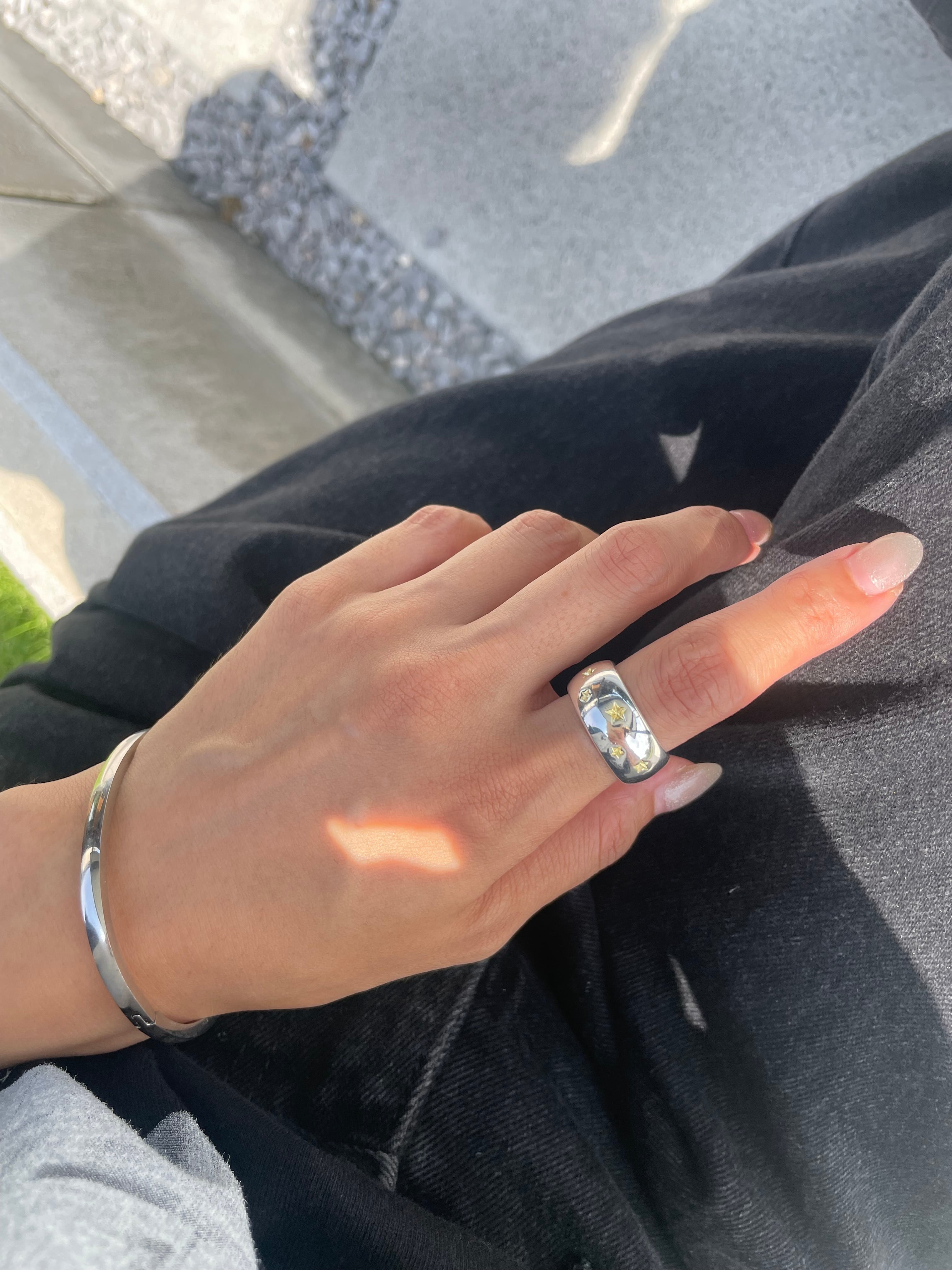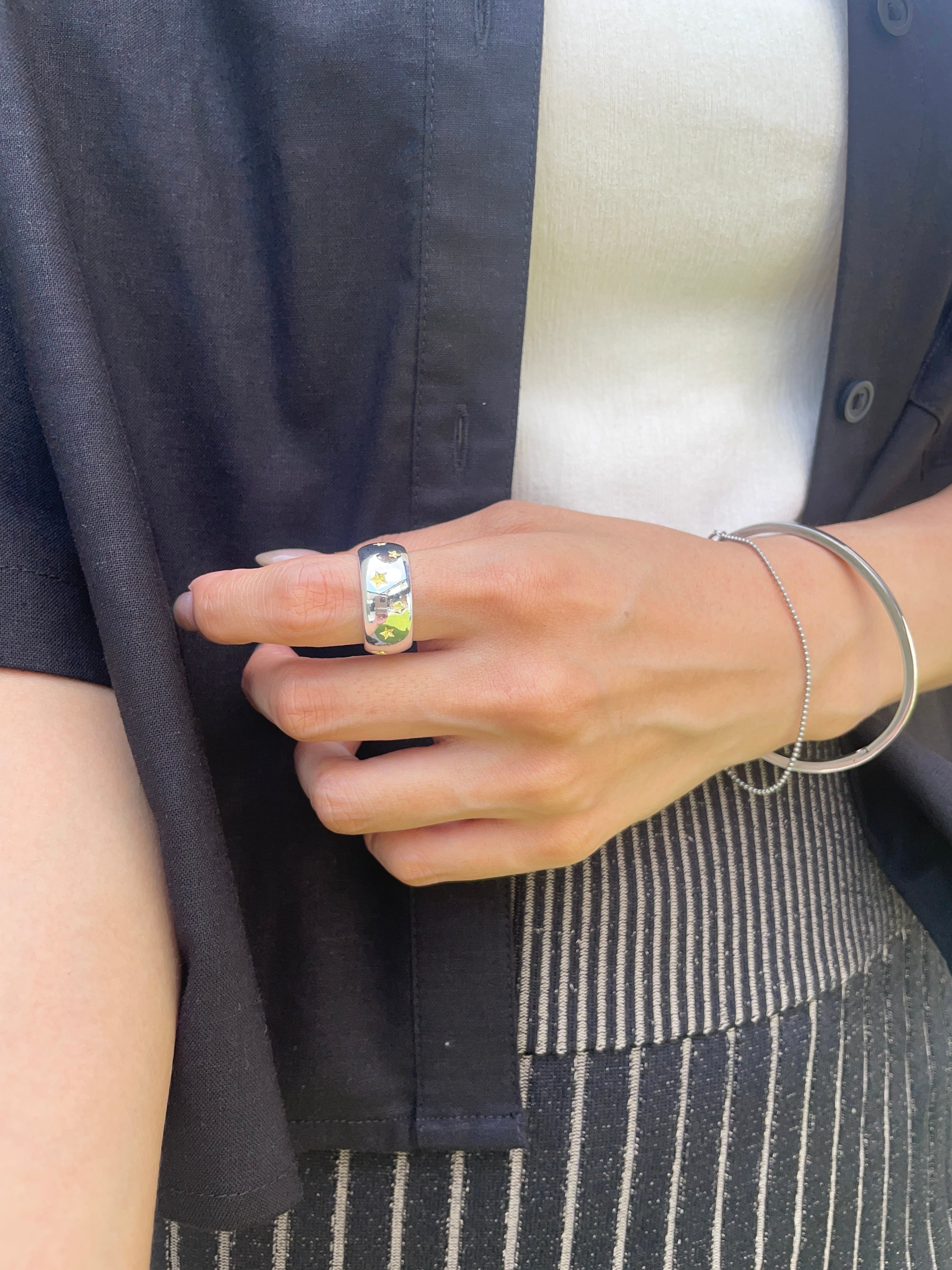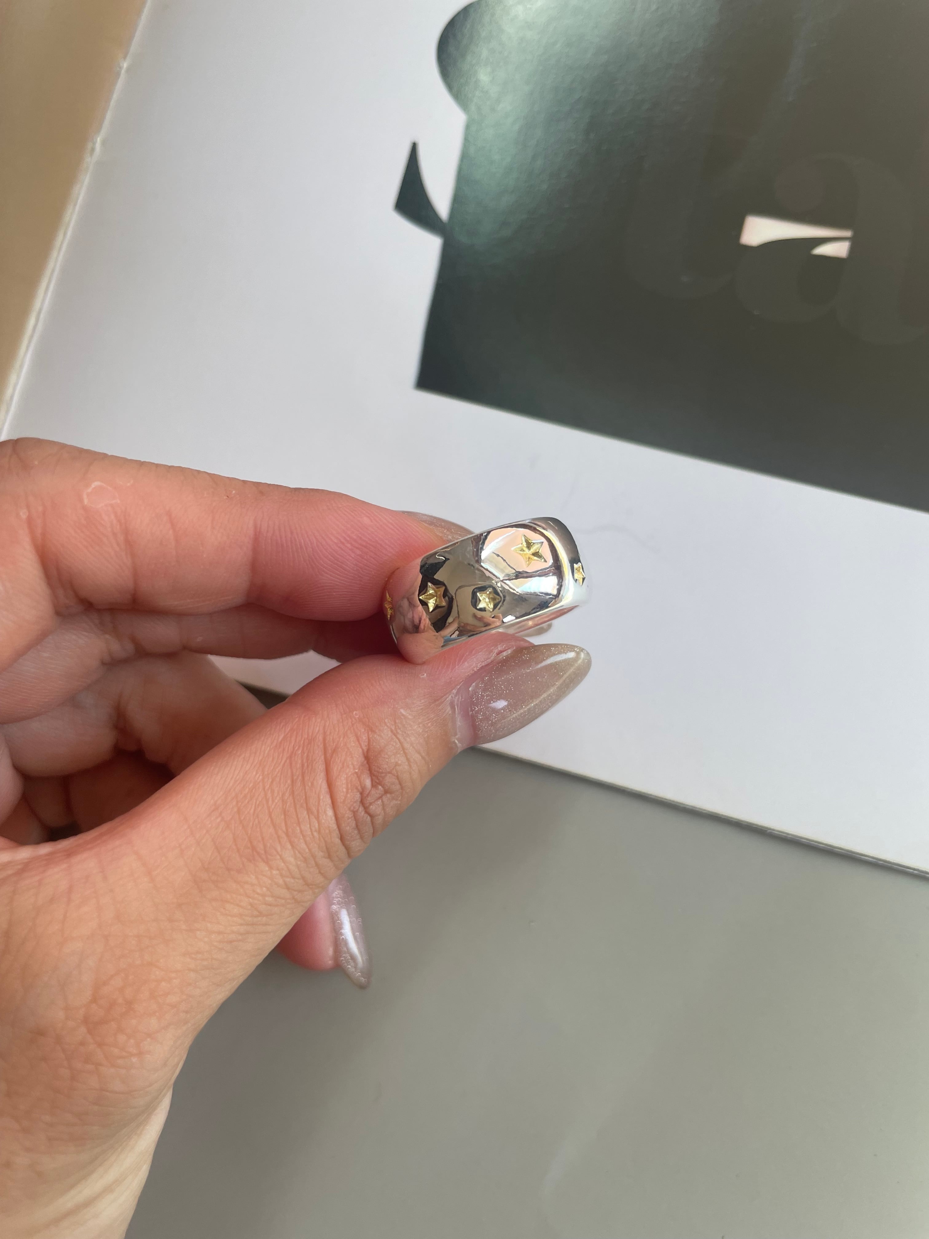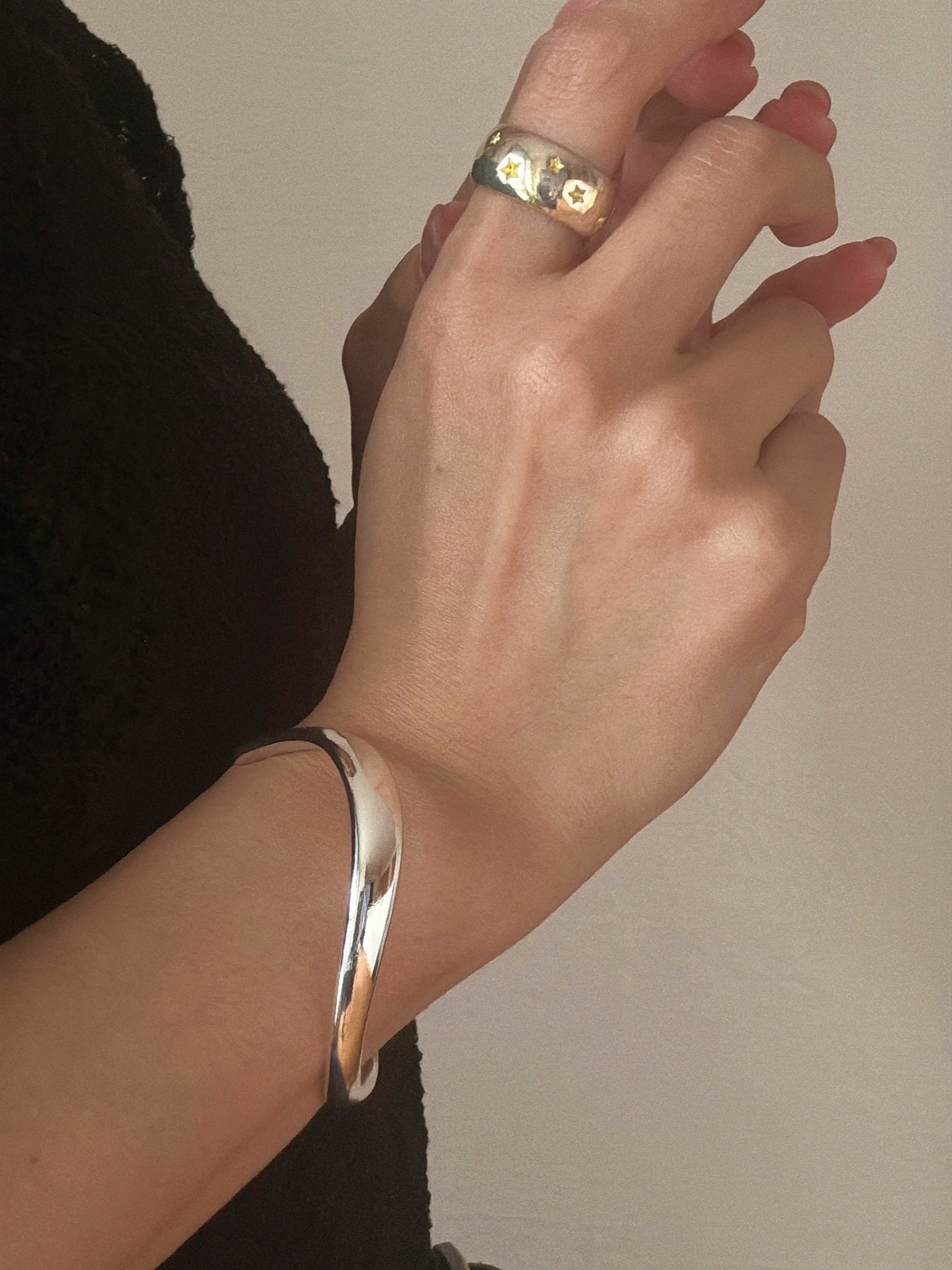 純淨的銀色鏡面戒上散布著精巧的金色星辰。